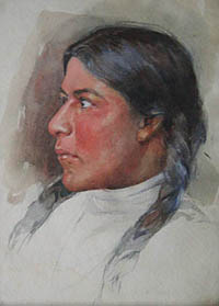 Inter-cultural interestsThe earliest sketches we have by Walter Haskell Hinton are of native people, made when he was a boy. Perhaps he drew them when he saw Buffalo Bill's Wild West show, which was operating in Chicago in 1893 during the World's Columbian Expo. His respect for the traditional cultures of native peoples remained with him his entire life. Hinton's depictions of Native Americans can be divided into three general categories: ethnological, historical, and popular. Like most Caucasian artists of his generation, Hinton preferred not to depict the modern lives of or issues facing native peoples. Instead, he cherished and celebrated their heritage, taking pains in his 1948 ethnological studies to make sure that the costumes and activities he depicted were historically accurate. Given the limitations of research resources available to him (mainly books and magazines supplemented by his own collection of artifacts), this goal must have been very difficult to achieve.