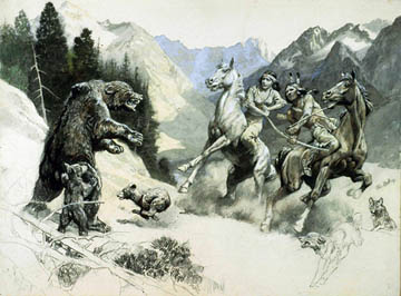 Fort Dearborn Massacre, 1812. In his popular images, which were produced as art prints, puzzles, and calendars, Hinton catered to the large market for sentimental, romanticized pictures of Native Americans before the time of reservations. In one series, a native couple has repeated, dramatic encounters with bears. That Hinton was appealing to an audience that cared more for fun than accuracy is suggested by the woman's tight and low-cut bodice, which is in keeping with 1930s standards of glamour but is not accurate for traditional Native women’s clothing.