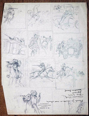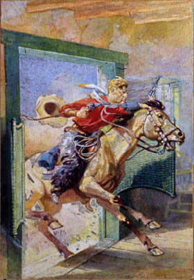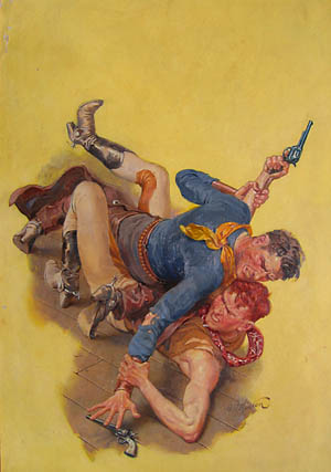 Hinton did work for several pulp magazines but seems to have steered clear of the truly violent and sexually explicit ones. Instead, he concentrated on the Western and historical subjects -- with the occasional foray into science fiction for titles that were art directed by William Hamling, who usually bought artwork from Hinton for Mammoth Western. WesternsIn the body of Hinton's work, it is difficult to say where pulp images end and serious Western art takes over. Because he liked Western subjects so well, many of his illustrations destined for cheap publications were as good as his better-paying work. They only differ in that they are highly dramatized and concentrate on the traditional climactic moments of popular Western literature: saloon shoot-‘em-ups, death-defying tumbles down cliffs, hell-bent horseback rides, and the like. Often, Hinton’s comprehensive renderings preserve more liveliness than his finished works, which tend to be very tightly rendered in keeping with the more precise, slick styles that gained in popularity in the 1930s. To appreciate this shift, one can compare the Western and pulp paintings to the farm magazine covers of the 1920s, which are softer and more Impressionist in the handling.