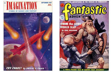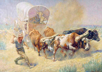 Comprehensive renderings in gouache (left), and ink with gouache (right). Original oil on canvas; publication unknown. Hinton’s more serious Western paintings are properly history paintings. Although these often feature elements calculated for popular taste such as pretty ladies and heroic celebrations of progress, they show considerable research and planning as well as careful execution. In this picture probably destined for art prints or puzzles, time is compressed as a pioneer wagon train heads out away from a futuristic city complete with airships. Original watercolour.