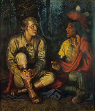 Although Hinton produced many of these popular scenes, he personally preferred the ethnological works. When he painted a set of 10 images for Mammoth Western depicting the major native tribes of North America, contrary to the normal contract terms he arranged to keep the original paintings – some of the only finished work made for magazines he ever kept. They hung in his house until the last years of his life. Beginning in the 1930s and continuing into the 1960s, Hinton painted a series of scenes in the life of General Washington. Two images in the series depict Washington meeting with a Native leader. Hinton’s client noted that Hinton depicted Washington and these leaders as equals: they share the foreground, leveling face to face with matched dignity, and in one Washington appears to humbly receive instruction from the Native chief. |
