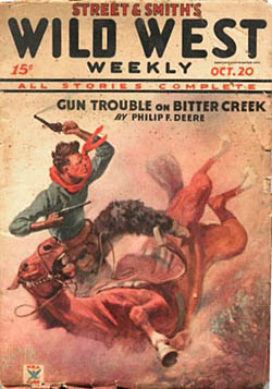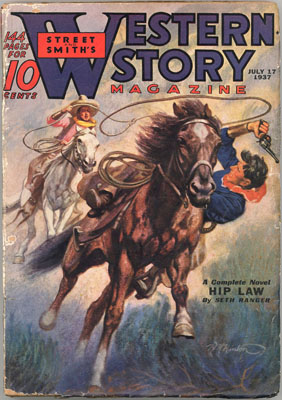 Hinton did work for several pulp magazines but seems to have steered clear of the truly violent and sexually explicit ones. Instead, he concentrated on the Western and historical subjects -- with the occasional foray into science fiction for titles that were art directed by William Hamling, who usually bought artwork from Hinton for Mammoth Western. WesternsIn the body of Hinton's work, it is difficult to say where pulp images end and serious Western art takes over. Because he liked Western subjects so well, many of his illustrations destined for cheap publications were as good as his better-paying work. They only differ in that they are highly dramatized and concentrate on the traditional climactic moments of popular Western literature: saloon shoot-‘em-ups, death-defying tumbles down cliffs, hell-bent horseback rides, and the like. Often, Hinton’s comprehensive renderings preserve more liveliness than his finished works, which tend to be very tightly rendered in keeping with the more precise, slick styles that gained in popularity in the 1930s. To appreciate this shift, one can compare the Western and pulp paintings to the farm magazine covers of the 1920s, which are softer and more Impressionist in the handling.