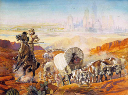 Comprehensive renderings in gouache (left), and ink with gouache (right). Original oil on canvas; publication unknown. Hinton’s more serious Western paintings are properly history paintings. Although these often feature elements calculated for popular taste such as pretty ladies and heroic celebrations of progress, they show considerable research and planning as well as careful execution. In this picture probably destined for art prints or puzzles, time is compressed as a pioneer wagon train heads out away from a futuristic city complete with airships. Original watercolour.