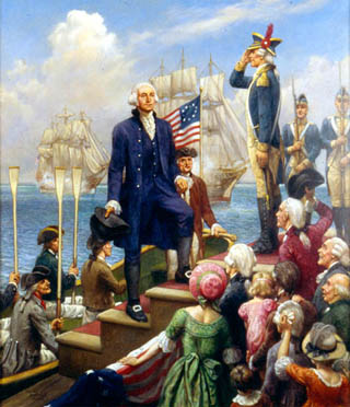 A major campaignWalter Haskell Hinton and the Washington National Insurance Company enjoyed a business relationship that lasted about 35 years, beginning in the late 1920s. During that time Hinton produced around 25 large paintings of episodes in the life of George Washington. With these images, the insurance company first produced calendars, and later, educational packages that were distributed for many years to schoolchildren to teach them about Washington and the American Revolution. The series also appeared in a television broadcast in 1975, which reached 80 million people. Hinton had been sent along to Washington National by the calendar firm of Brown & Bigelow, who hoped the company would order promotional calendars. Hinton's aptitude for history painting combined with his knowledge of the 18th century happened to fit plans that the corporation already had underway to commission paintings of George Washington's life. Hinton solved a dilemma they were having: all the paintings they already had commissioned from other artists focused on military themes, but they wanted non-miltary subjects since public sentiment at that time was not sympathetic to war. Right there in the office, Hinton began sketching out pictures of Washington in his daily life as a family man and young professional, and he won the contract. From then on, Hinton usually came up with the scenes on his own and proposed them to the Company. He was careful to paint only episodes that actually happened, so the story of young George cutting down a cherry tree, known to be a myth, is not included. Washington is seen going about his daily life as a surveyor, stepfather, brother, general and statesman. A main challenge was keeping Washington’s likeness consistent not just from panel to panel, but with popular portraits of him as well. He had to be recognizable to children. As a result, Washington looks rather wooden and expressionless in the series. The repetition of this stoic, ennobled Washington helped instill him as a national icon for students.